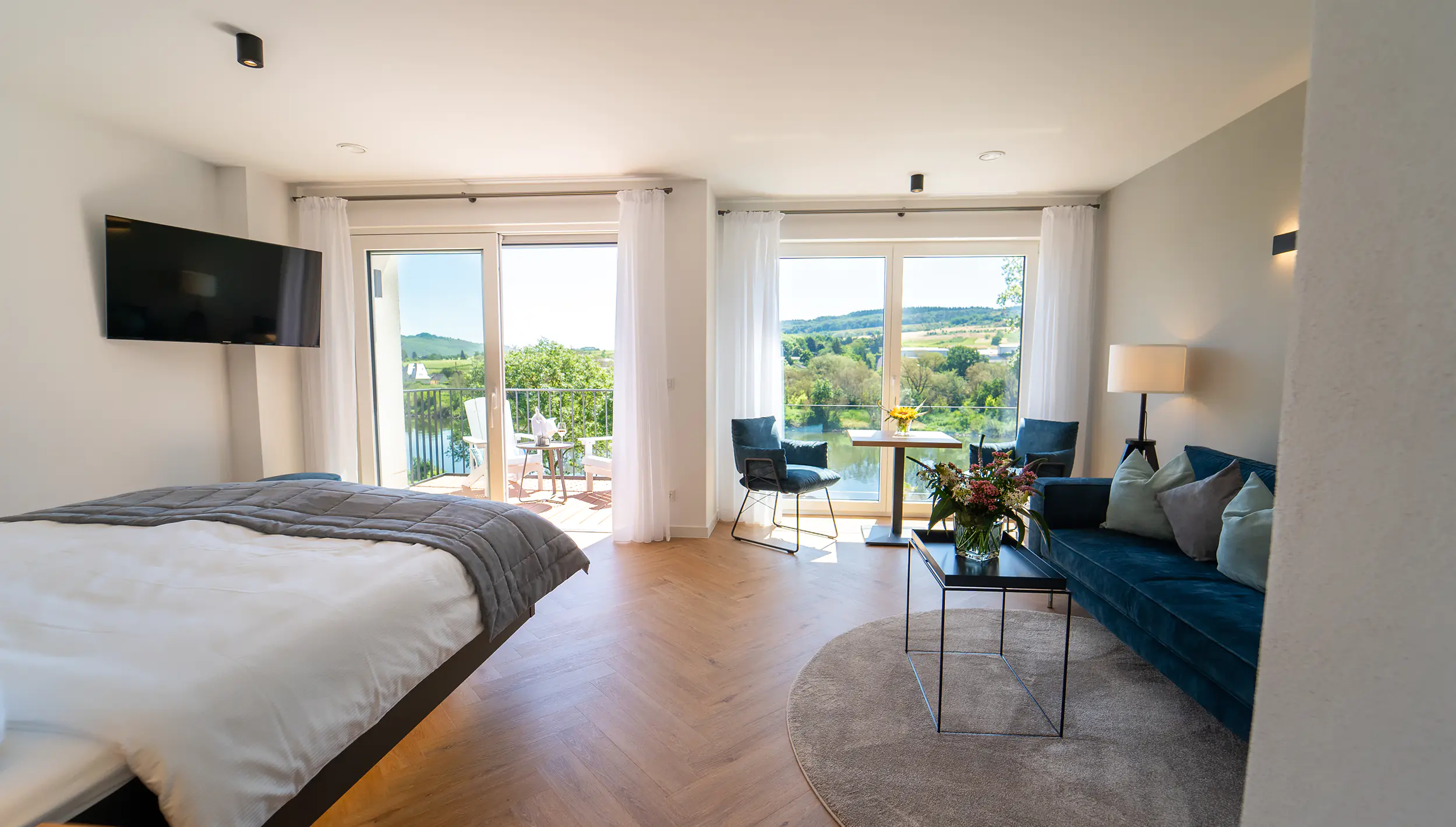 Aber das ist noch nicht alles: hervorragende Kulinarik, Relaxen direkt am Moselufer und modernes Design, eingebettet in die ganze Pracht des Moseltals, umrahmt von den Steilhängen der Weinberge. Entspannte Atmosphäre – ohne Stress, ohne Dresscode.